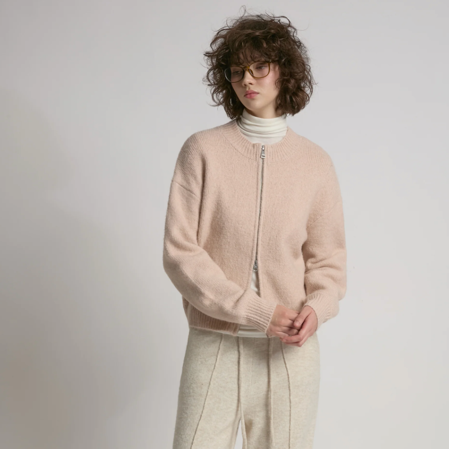 Effortlessly modern and quietly cozy, this Crop Zip-Up Cardigan features a semi-cropped length and voluminous raglan sleeves for a soft, sculptural silhouette. The hairy knit texture lends warmth and dimension, while the clean two-way zip closure keeps the look minimal and refined. Easy to pair with high-waisted trousers or layered over a turtleneck, it’s a versatile piece that transitions seamlessly from lounge to street.