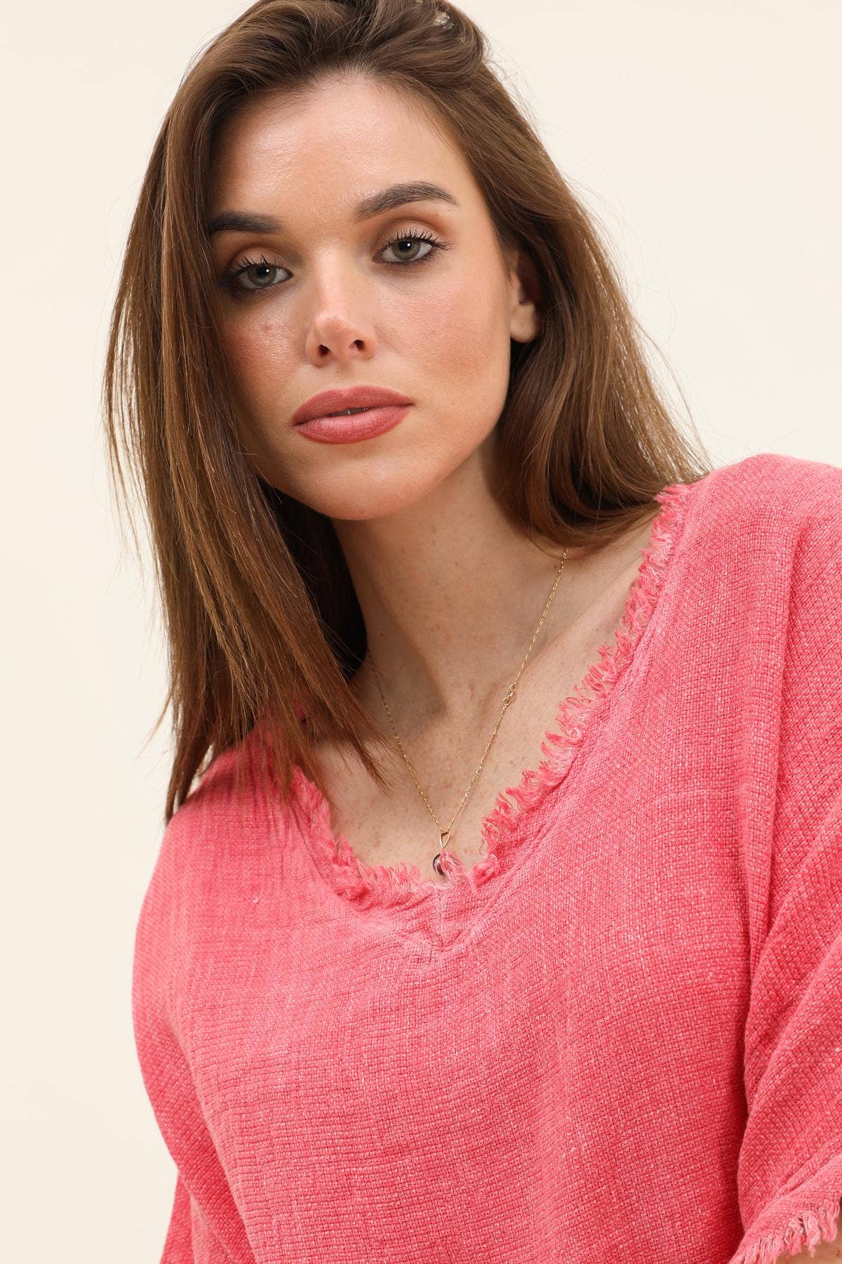 Stay effortlessly cool in our Italian-crafted Linen Blouse. This versatile one-size-fits-all top combines the breathability of 50% linen with the softness of 50% cotton, featuring stylish raw edges that elevate your casual look. The stunning coral hue brightens your summer wardrobe, making this the perfect companion for even the hottest days.