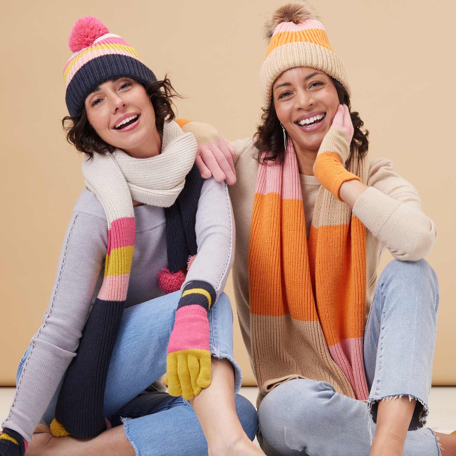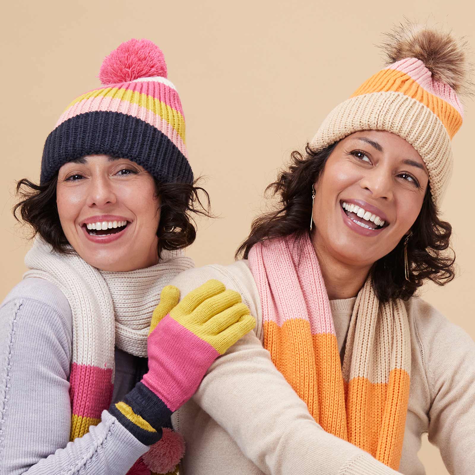 Stay on trend this fall season with this knit scarf featuring a fun yet super wearable orange, pink and tan color block design. This soft scarf looks great paired with a winter coat, or worn as a cozy wrap! Don't forget to pair it with its matching beanie and gloves!