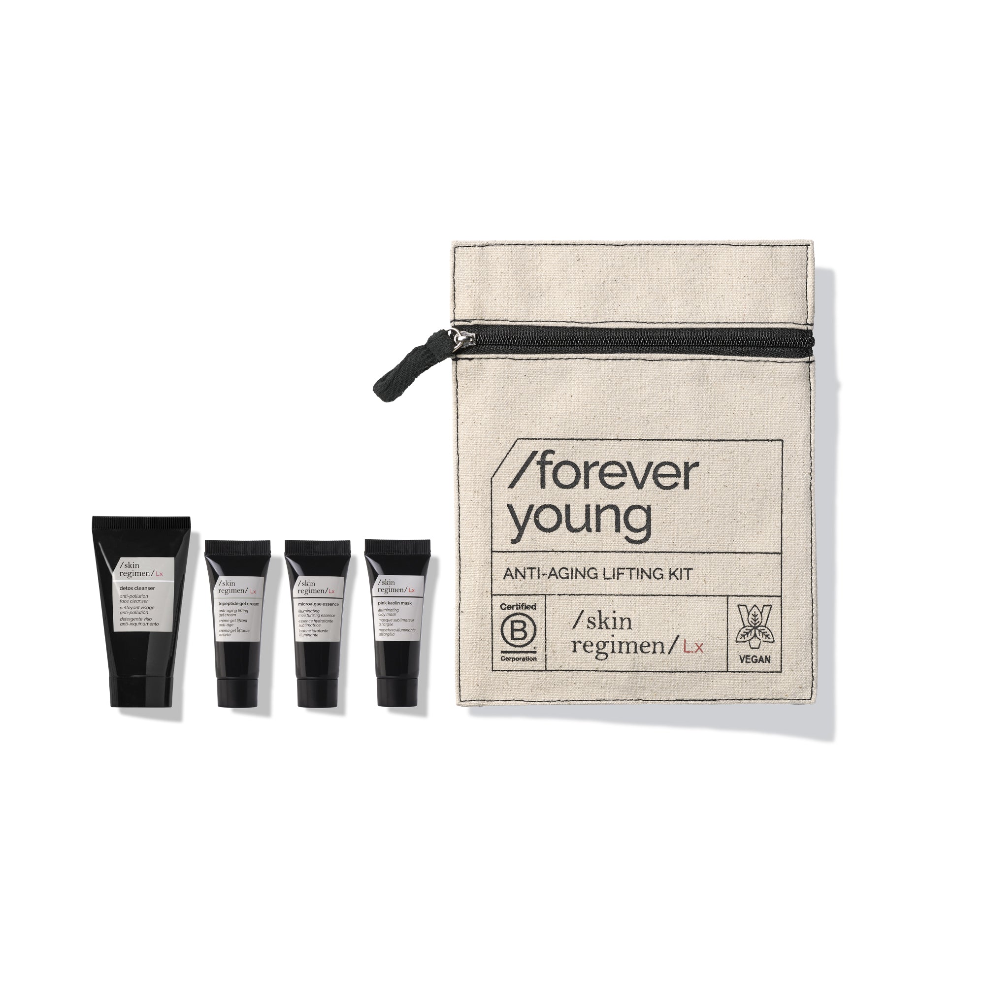 Tackle each day with radiant and visibly younger-looking skin, thanks to the Forever Young Kit. Inspired by the song that celebrates eternal youth, this exclusive routine, formulated with the powerful Longevity ComplexTM, is your secret to timeless beauty. Counteract visible signs of aging with a blend of key ingredients that improves skin elasticity for a healthier, more luminous appearance. The kit contains: /skin regimen/Lx Detox Cleanser (50 ml), /skin regimen/Lx Microalgae Essence (10 ml), /skin regimen/Lx Tripeptide Gel Cream(10 ml), and /skin regimen/Lx Pink Kaolin Mask (10 ml).